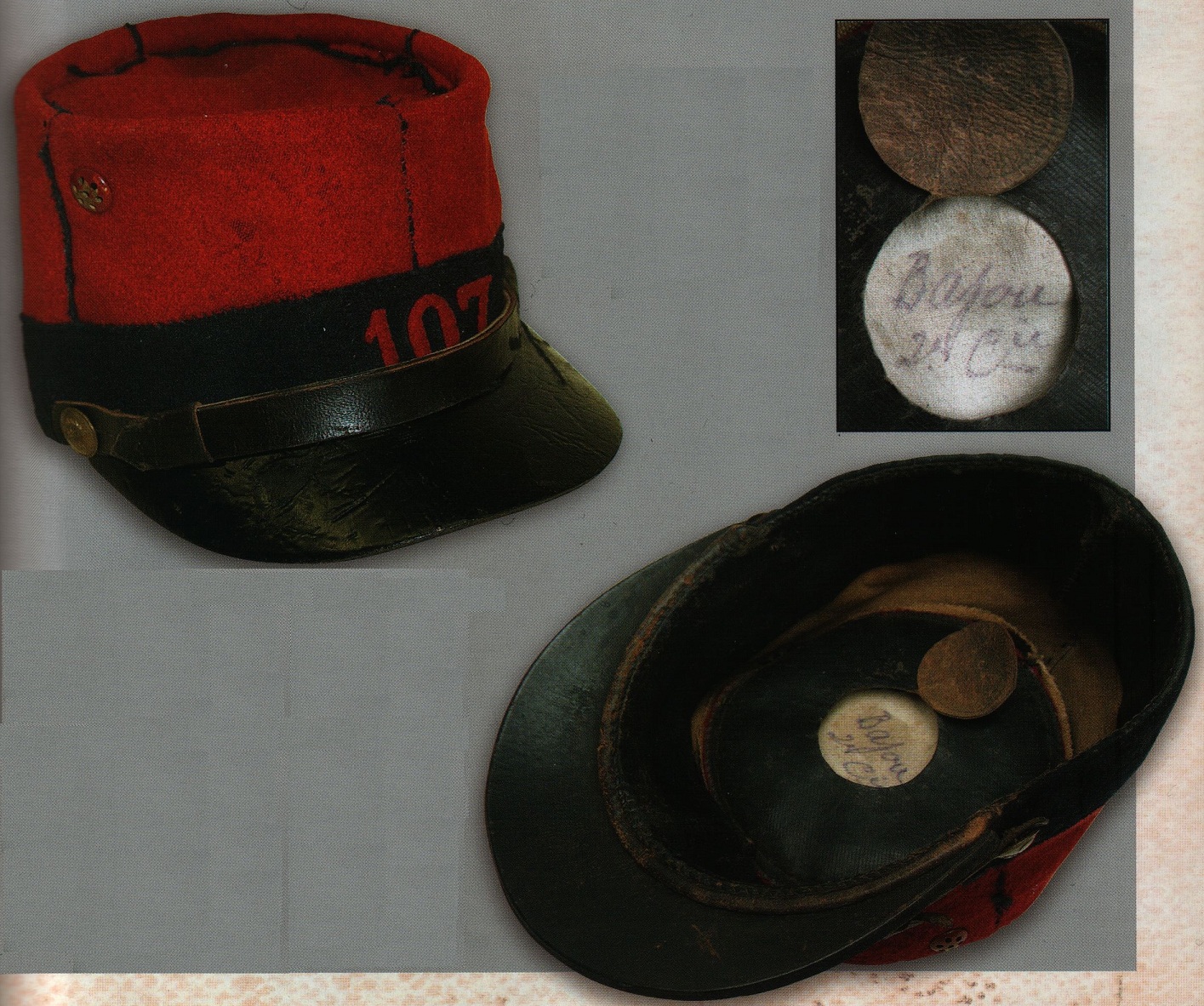A headband of blackened animal hide, 50 mm high, was sewn to the interior of the Kepi, along with a cover piece sewn against the backside of the cap. In comparison to the all-encompassing pieces used in other services (e.g. the artillery, engineers, cuirassiers and dragoons), the infantry version was referred to as reduced. A circular patch was cut in the center of the cover piece could be flipped back and a piece of cloth inserted between it and the wool on which the soldier would inscribe his last name and company (alternately, a regimental, manufacturer, serial number or size stamps appear here). Between the headband and the wool was a shell of treated linen liner maintained by the turned-down vent teeth and a few stitched points. Though in theory the shell was to always be included in war-time, depleted stocks in 1914 meant that some reserve regiments were provided kepis without the shell, which lent the hat a truly formless shape.
