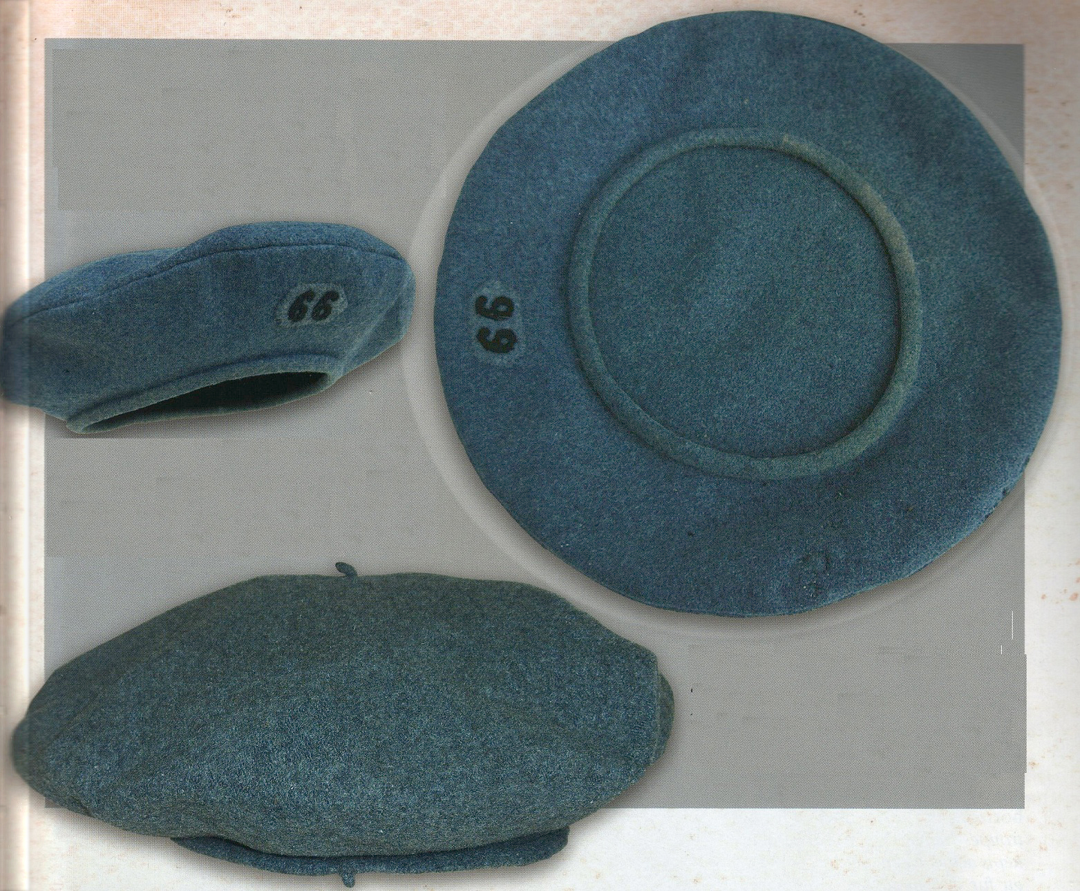 Three images showing regulation berets worn in various manners.