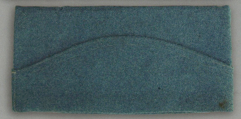 Before the war the police bonnet (more casually referred to as the calot, or "cap") was reserved for off-duty wear. As the name indicates ('police' referring specifically to the brig), it was typically worn while performing chores, punishment duties or while off-duty in the barracks. Adopted in 1891, the bonnet was made in iron blue-gray and composed of five pieces: the two flaps, the two sides of the turban, and the cap. The cap itself was folded down the center. The top edge of each flap is hemmed and mended by two parallel seams. The flaps were held up by a small metal hook sewn into the interior of the cap, which attached to a fixed loop on the turban. Kepi 012 (3).jpg?dl=0">