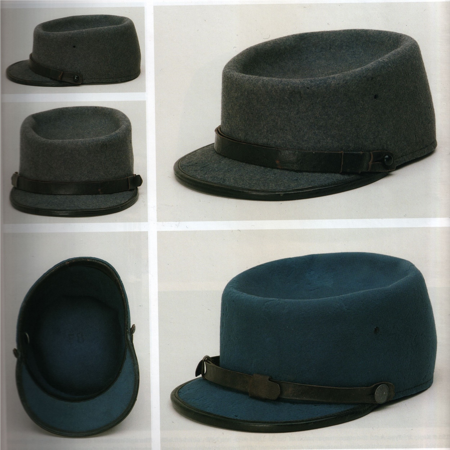 Certainly the most bizarre Kepi produced was that distributed at the end of 1914. Made in two molded pieces, shell and visor bordered in leather, in a thick gray blue felt. It was fitted with the classic chinstrap. Aeration was achieved by a single eyelet on either side of the cap. It has been put forward that the felt Kepi was actually a pre-war design that had not gone into production but which the Quarter-Master decided to distribute out of concerns of economy. The fragility of the felt kepis was clearly evident, as it was easily crushed when not being worn. It was also sensitive to moisture and became easily deformed in the rain. As such, the felt kepis were mostly relegated to troops at the depots and not commonly distributed to soldiers in the forward zones.