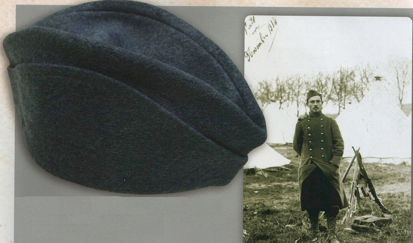M1884/14 1st Type: With the first shipments of the new uniform cloth, manufacturers begin to produce kepis in the cloth without waiting for the description given in the official notice of 19 September 1914. As such, kepis identical in cut and ornamentation to the existing M1884 were produced with the exception that all pieces were made entirely of the same color cloth. The old iron blue wool was used, as was dark blue and the new light blue (again, in various shades). They were also still garnished with dark blue piping. Light blue piping was also used.