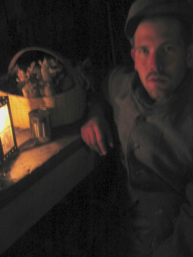 Sdt. Schech takes a moment to warm up in the bunker, April 2005.